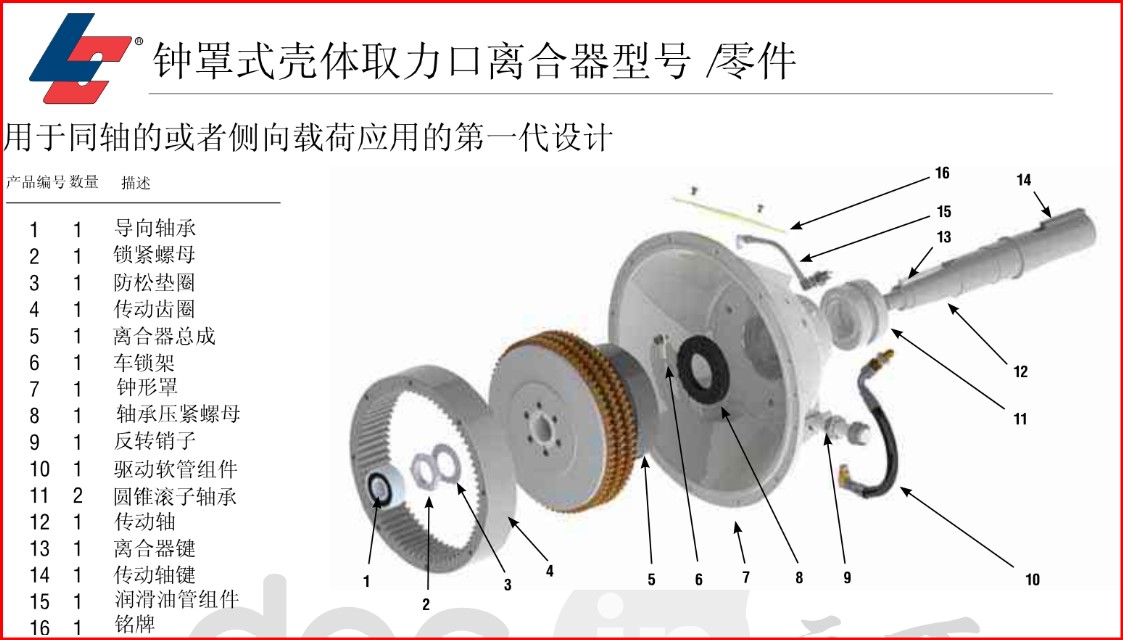 Logan氣/液驅動 鐘罩式殼體取力口離合器式自調節(jié)的,設計成直接安裝到柴油發(fā)動機或者汽油發(fā)動機的飛輪上。摩擦圓盤組為干式應用設計。通過一個固定的缸套-活塞布置或者通過內(nèi)置軸和離合器油道來完成。離合器的傳動軸通過內(nèi)孔或鍵槽來安裝。扭矩從盤片組傳遞到安裝在發(fā)動機飛輪上的齒輪傳動齒圈上。Logan離合器主杠加壓, 推動活塞夾緊或鎖住摩擦片或分離鋼片。當壓力移走, 回位彈簧使摩擦片和鋼片分離, 當鋼片和摩擦片分離后, 可以保持運行間隙。