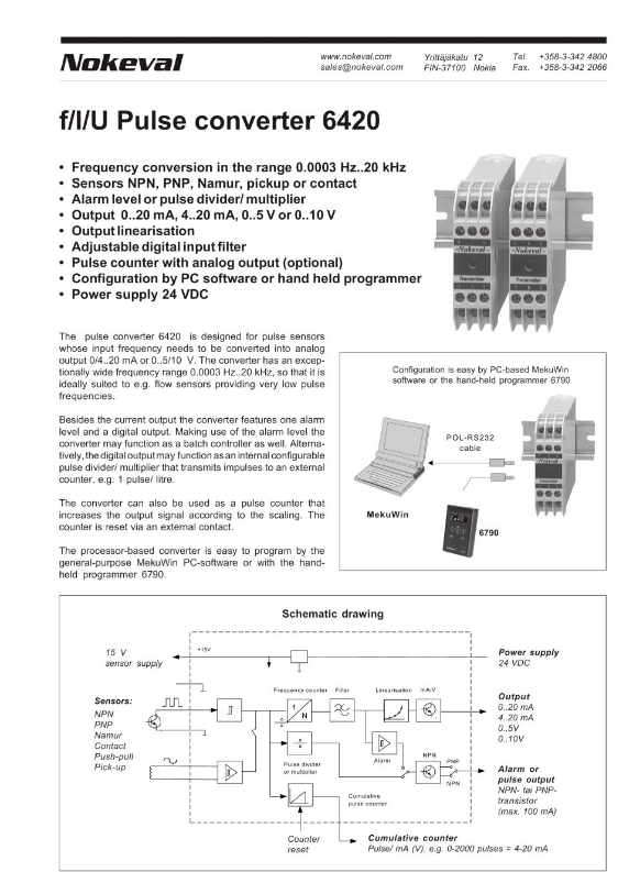 脈沖轉(zhuǎn)換器6420設(shè)計(jì)用于需要將輸入頻率轉(zhuǎn)換為0/4...20 mA或0...5/10 V模擬輸出的脈沖傳感器,該轉(zhuǎn)換器的頻率范圍非常寬,為0.0003 Hz...20 kHz,因此非常適合提供非常低脈沖頻率的流量傳感器。 除了電流輸出,轉(zhuǎn)換器還具有一個報警電平和一個數(shù)字輸出。利用報警電平,轉(zhuǎn)換器也可以作為一個批處理控制器來使用。另外,數(shù)字輸出可以作為一個內(nèi)部可配置的脈沖分壓器/乘法器,將脈沖傳輸?shù)酵獠坑?jì)數(shù)器,例如1個脈沖/升。 轉(zhuǎn)換器也可以作為脈沖計(jì)數(shù)器,根據(jù)縮放增加輸出信號。計(jì)數(shù)器通過一個外部觸點(diǎn)進(jìn)行復(fù)位。 基于處理器的轉(zhuǎn)換器很容易通過通用的MekuWin PC軟件或手持式編程器6790進(jìn)行編程。