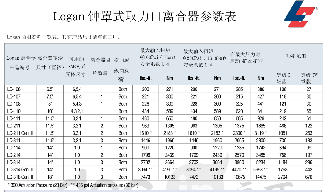 Logan氣/液驅動 鐘罩式殼體取力口離合器式自調節(jié)的,設計成直接安裝到柴油發(fā)動機或者汽油發(fā)動機的飛輪上。摩擦圓盤組為干式應用設計。通過一個固定的缸套-活塞布置或者通過內(nèi)置軸和離合器油道來完成。離合器的傳動軸通過內(nèi)孔或鍵槽來安裝。扭矩從盤片組傳遞到安裝在發(fā)動機飛輪上的齒輪傳動齒圈上。Logan離合器主杠加壓, 推動活塞夾緊或鎖住摩擦片或分離鋼片。當壓力移走, 回位彈簧使摩擦片和鋼片分離, 當鋼片和摩擦片分離后, 可以保持運行間隙。